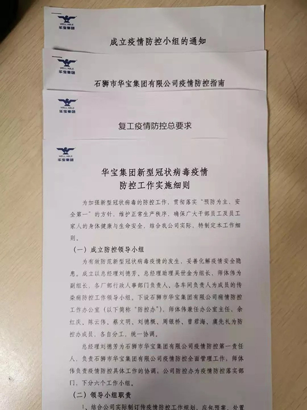 2.成立工作小組,強化抗“疫”責任落實 在華寶集團黨支部牽頭下,公司于元月28日成立了以集團總經理為主的防控小組,多名黨員為組員,落實責任分工和防控責任。防控小組24小時待命指揮,保證公司生產有序,環境安全。