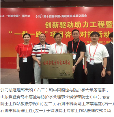 該會上為10家新建院士專家工作站、10個院士專家示范工作站授牌,我司院士專家工作站在列,也是石獅市第三家省級院士專家工作站。中國工程院胡壯麒院士及其專家團隊進駐我司院士工作站,對接項目是“高性能重防腐新型材料的研究與開發”,此次對接將院士及其專家團隊在專業領域的前沿科技成果,與石獅市新材料產業對接,以科技創新突破產業發展瓶頸,以高端智力引領產業轉型升級,為石獅實業強市做出新的貢獻。省科協、泉州市政府、石獅市政府、科協等各官方網站及各電視臺、報紙均對此做出各類報道。