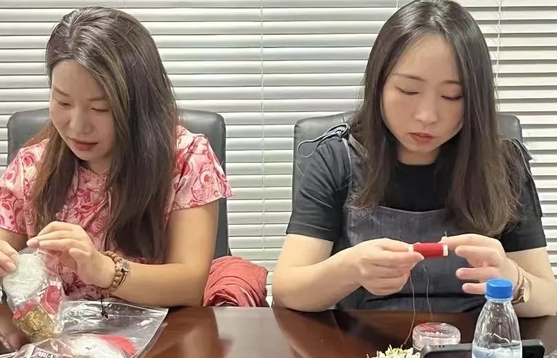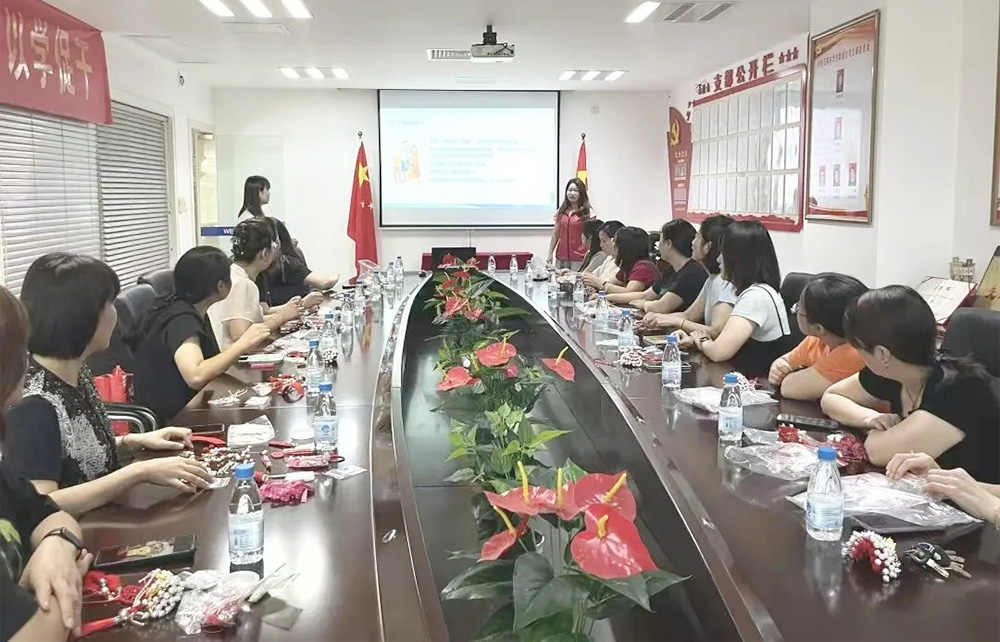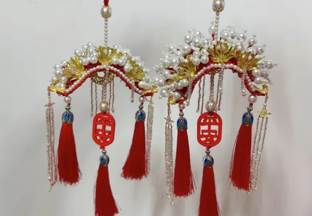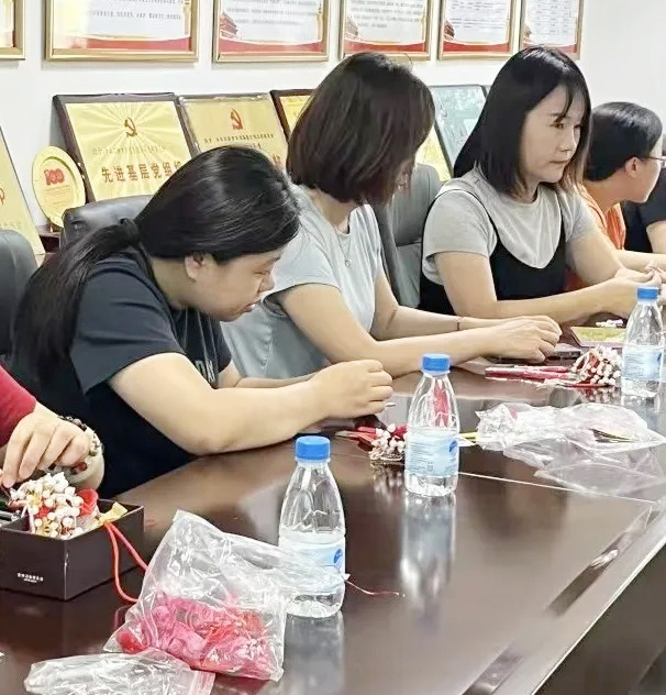 最后,石獅市華寶集團婦聯成員以珍珠為瓣,金絲為媒,鳳凰為翼,通過“截”、“折”、“扭”、“串”等系列動作,將一頂頂鳳冠掛件制作完成。傳統冠飾的工藝嚴謹,象征著家風中的規矩與教養,以鳳冠為象征,賦予家風精神內涵。